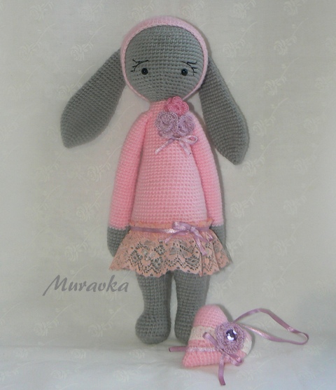 Связались две заюшки, такие скромницы получились. Достаточно большие, рост чуть больше 30 см. Нравится мне это спокойное сочетание розового и серого.