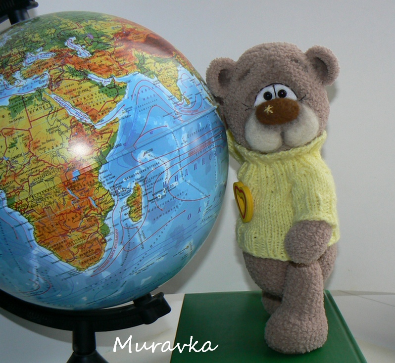 Мишка связан по описанию Наташи NIB из ниточек Софти, ростиком вышел где-то около 20 см (не успела измерить перед отправкой). Мордочка приваляна, голова крутится, лапки двигаются, тонировочка, свитерок... В общем, мне самой очень нравится:)
